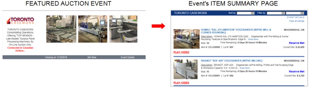 Alternatively, select one of the "FEATURED AUCTION EVENTS" (in closing order) in the middle of the Auction site's home page. Click anywhere within the Auction Event billboard for a summary of items for that Event.