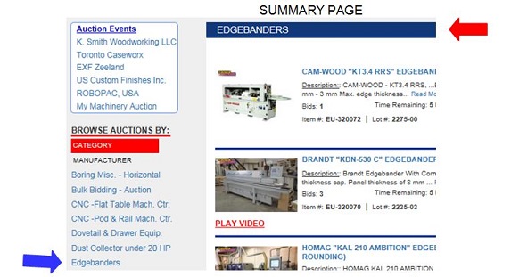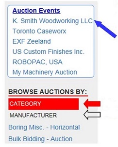 Navigate to current "in auction" items using the links on the left side of each auction page (as shown here). You may view items within an Event, by Category, or by Manufacturer.